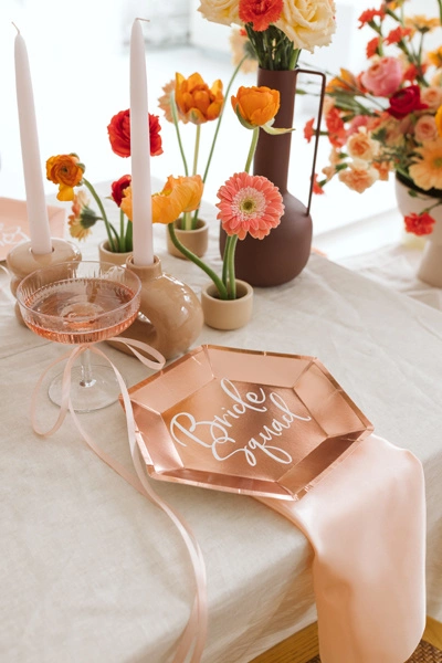 - Talerzyki papierowe w kolorze różowego złota z białym napisem Bride squad, średnica ok. 23 cm. (1 op. / 6 szt.)