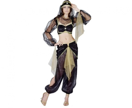 Kompletny strój tancerki brzucha składający się z topu, spodni, ozdobnego paska oraz opaski z welonem. Kolory: złoty i czarny. Rozmiar M, materiał 100% poliester. Przeznaczony na wieczory tematyczne, wieczory panieńskie, występy taneczne i karnawał — zapewnia lekkość i swobodę ruchu.