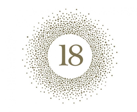 Serwetki papierowe 18 Golden Dots — 20 sztuk, 33×33 cm. Białe serwetki z złotym nadrukiem „18” i wzorem kropek, wykonane z trójwarstwowego papieru. Najlepiej nadają się na osiemnastki; można je także wykorzystać przy eleganckich przyjęciach, rocznicach i przyjęciach okolicznościowych.