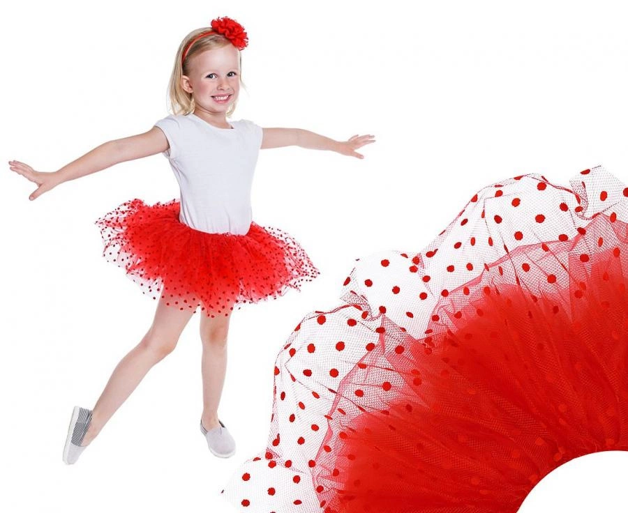 Spódnica tutu dziecięca, czerwona w białe kropki, pięciowarstwowa (zewnętrzny tiul), długość 23 cm. Elastyczny pas 56–70 cm, materiał poliester. Przeznaczona dla dzieci powyżej 3 lat; odpowiednia na karnawał, urodziny, sesje zdjęciowe i zabawy tematyczne.