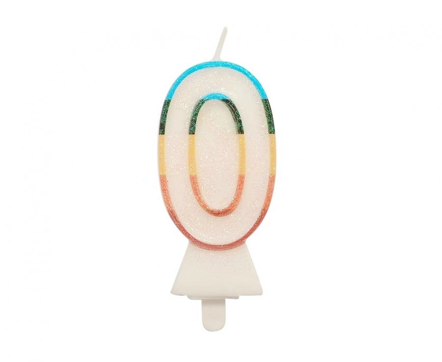 Świeczka w kształcie cyfry 0, kolor tęczowy z powłoką z bio brokatu. Wysokość świeczki 8,5 cm, z podstawką 10 cm, 1 sztuka. Przeznaczona do ozdabiania tortów i stołów podczas urodzin, rocznic, baby shower, wieczorów panieńskich i podobnych okazji.