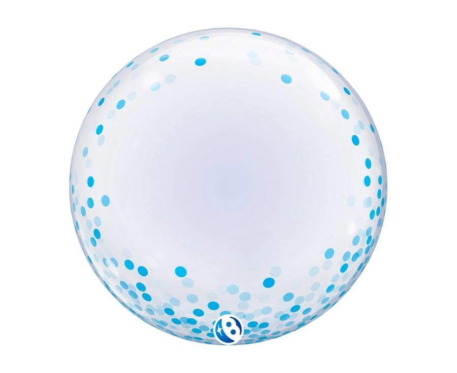 Balon Takara DECO Blue Confetti Dots (24" / 61 cm) to przezroczysty balon typu bubble z nadrukiem niebieskich kropek konfetti. Sprzedawany pojedynczo, nadaje się do dekoracji stołu, tła do zdjęć lub jako element kompozycji na wesele, urodziny, baby shower czy wieczór panieński.