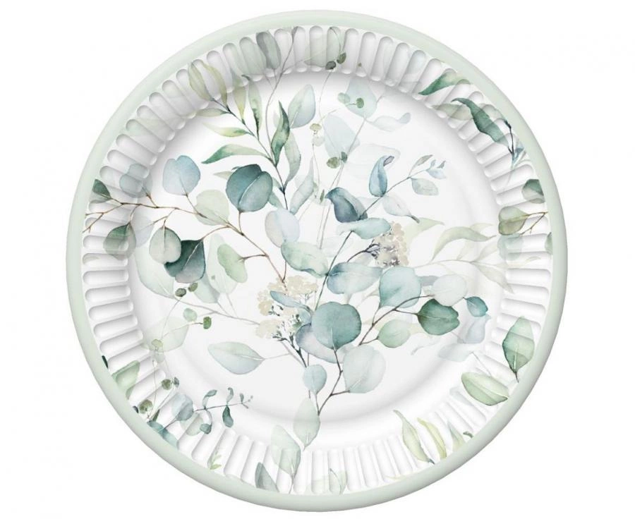 Talerzyki papierowe Eucalyptus Twigs o średnicy 18 cm, 8 sztuk w opakowaniu. Papierowe, okrągłe talerzyki z motywem gałązek eukaliptusa, przeznaczone do serwowania przekąsek i deserów na przyjęciach takich jak wesele, wieczór panieński, urodziny czy baby shower — praktyczne i jednorazowe rozwiązanie do serwowania niewielkich porcji.