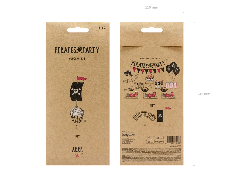- Zestaw do muffinek Piraci, zestaw zawiera 6 papilotek wykonanych z papieru kraft (wymiary po złożeniu ok. 4,8 x 7,6 x 4,6 cm) oraz 6 pików (wysokość ok. 20 cm). (1 op. / 6 szt.)
