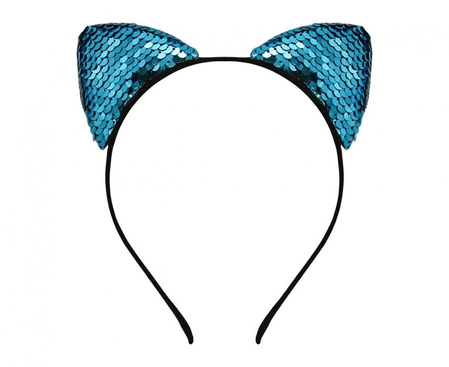 Opaska „Kot z cekinami” to plastikowa opaska w kolorze niebieskim ozdobiona cekinami. Wysokość całkowita 16 cm (uszka 6 cm). Produkt pojedynczy, przeznaczony jako element przebrania lub dodatek do stylizacji na wieczór panieński, urodziny, Halloween, baby shower lub jako rekwizyt do sesji zdjęciowej.