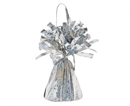Ciężarek foliowy do balonów z helem w kształcie stożka, pokryty holograficzną srebrną folią. Wysokość 12 cm, waga 145 g, opakowanie zawiera 1 sztukę. Przeznaczony głównie do balonów napełnianych helem; nadaje się do dekoracji na wesele, urodziny, baby shower oraz innych imprez, gdzie wymagane jest stabilne podtrzymanie balonów.