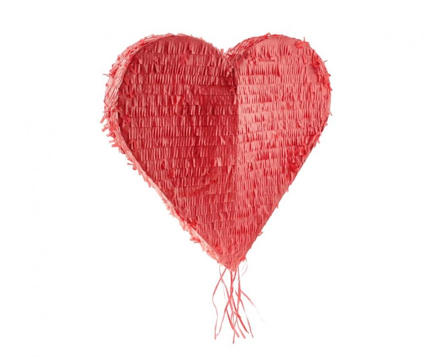 Piñata w kształcie czerwonego serca, wymiary 45 x 45 x 7 cm, na sznurki do ciągnięcia. Przeznaczona do użytku domowego i na imprezy takie jak urodziny, walentynki, baby shower czy wieczór panieński. Wysyłana pusta, do samodzielnego napełnienia drobnymi upominkami.