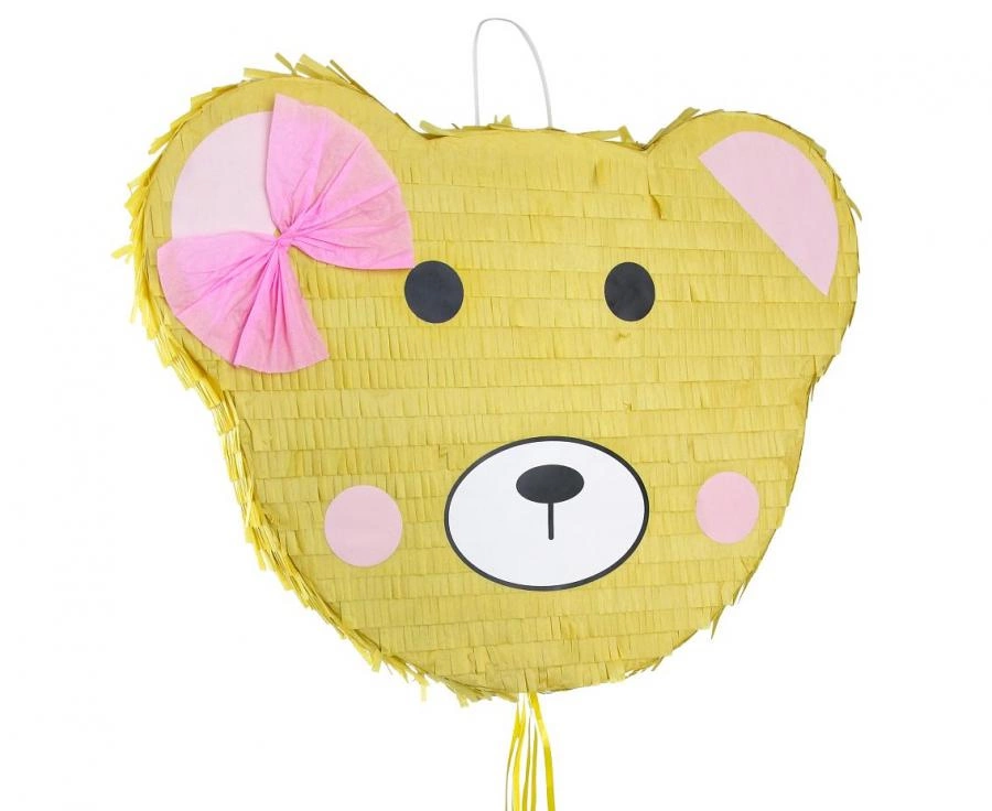 Piniata w kształcie misia z kokardką o wymiarach 45×7×35,5 cm. Produkt marki Godan, dostępny w kolorach jasnożółtym i różowym, sprzedawany jako 1 sztuka. Przeznaczona do wypełnienia słodyczami, drobnymi zabawkami lub konfetti; odpowiednia na urodziny dzieci, baby shower oraz przyjęcia rodzinne.
