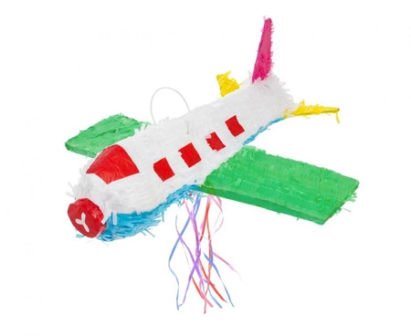 Piniata w kształcie samolotu o wymiarach 46×11×44 cm, wykonana ręcznie przez Godan S.A. Kolorowa piniata na sznurki — zamiast rozbijania dzieci ciągną za linki, stopniowo uwalniając słodycze i drobne upominki. Polecana przede wszystkim na urodziny dziecięce i przyjęcia tematyczne.