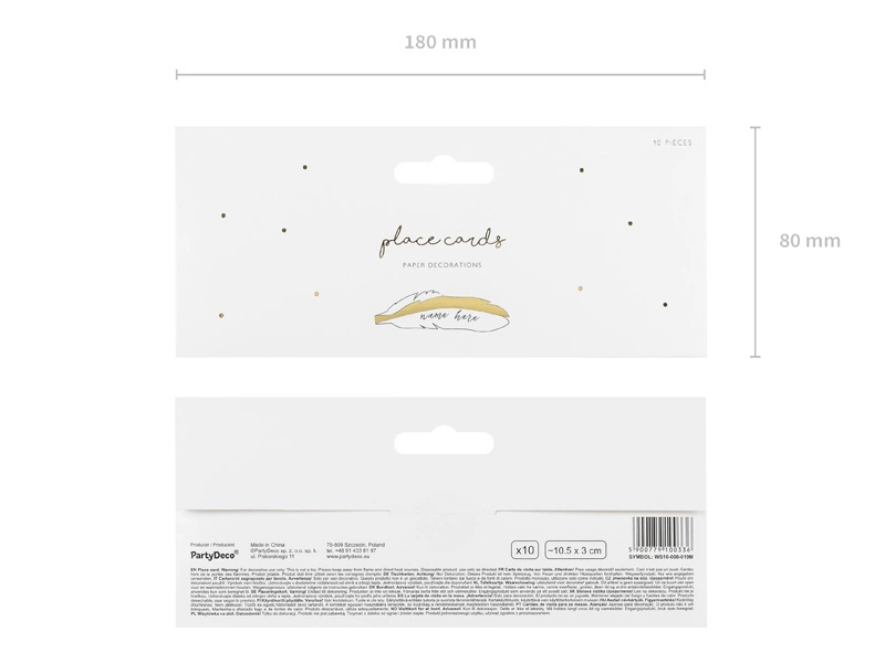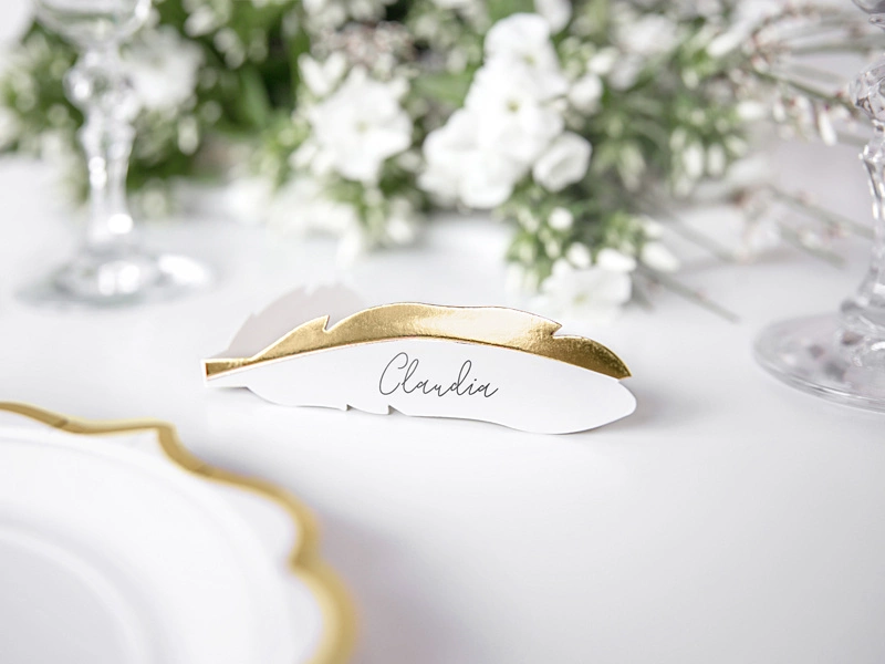 - Wizytówki na stół w kształcie piórka, wykonane z papieru w kolorze białym ze złotym metalizowanym brzegiem, wymiary po złożeniu ok. 10,5 x 3 cm. (1 op. / 10 szt.)