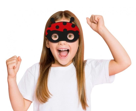 Maska filcowa w kształcie biedronki, wykonana z filcu, o wymiarach 18,5 × 14 cm. Uniwersalny rozmiar z elastyczną gumką umożliwia szybkie założenie i dopasowanie. Najlepiej sprawdzi się jako prosty element przebrania na wieczór panieński, urodziny, baby shower, Halloween lub tematyczne sesje zdjęciowe.