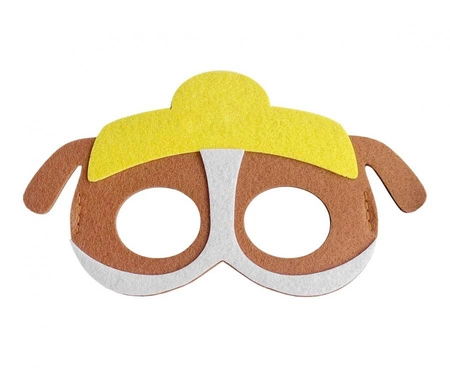 Maska filcowa "Psia Brygada - Konstruktor" to pojedyncza maska kostiumowa wykonana z filcu, mocowana na cienkiej elastycznej gumce. Część twarzowa ma wymiary 18 x 10,5 cm (całość 21 x 13,5 cm). Przeznaczona głównie na dziecięce urodziny, bale przebierańców i Halloween.