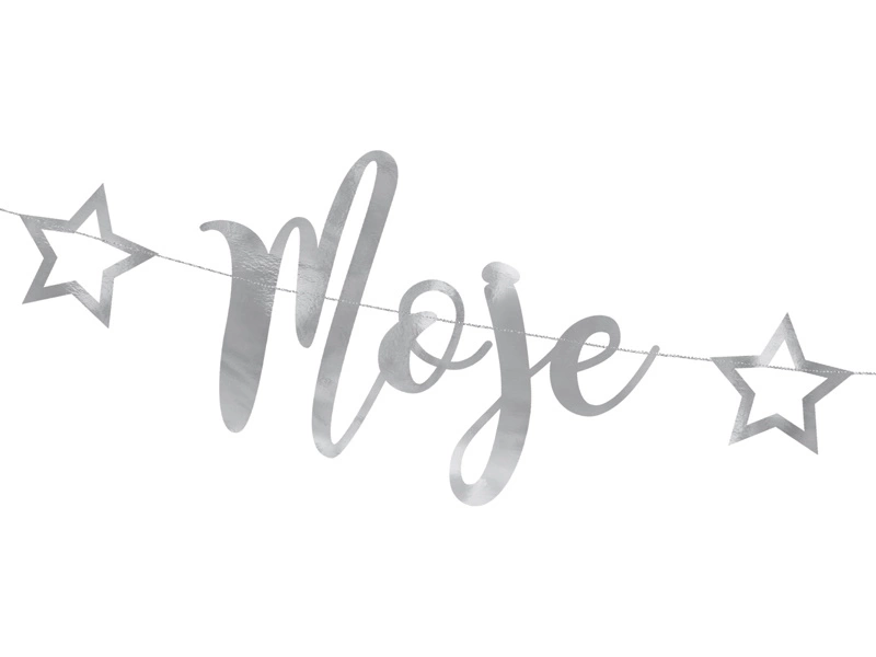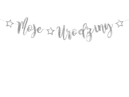 - Baner przeszywany Moje urodziny, wykonany z papieru lustrzanego w kolorze srebrnym, wymiary: wysokość ok 16,5 cm, długość ok. 90 cm.