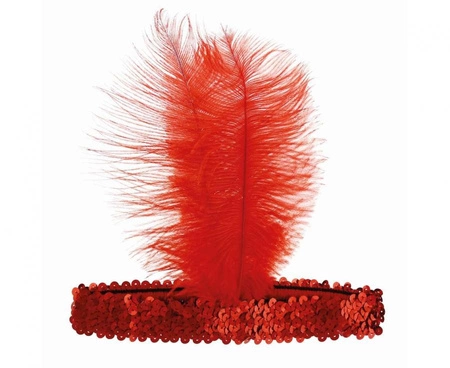 Opaska Retro - Kabaret w kolorze czerwonym to elastyczna opaska na głowę (obwód 50–60 cm) wykonana z czerwonej gumki, ozdobiona czerwonymi cekinami oraz piórem o długości 20 cm. Przeznaczona na imprezy tematyczne: wieczór panieński, karnawał, Walentynki, Halloween, sesje zdjęciowe i przyjęcia urodzinowe.
