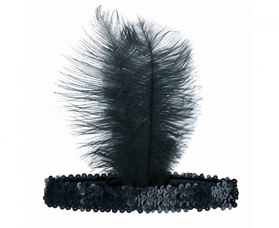 Opaska Retro - Kabaret, czarna to elastyczna opaska na głowę (1 szt.) ozdobiona czarnymi cekinami i pojedynczym piórem o długości 20 cm. Obwód 50–60 cm pozwala na dopasowanie do większości głów. Produkt przeznaczony na imprezy tematyczne: karnawał, wieczór panieński, kabaret, Sylwester i sesje zdjęciowe.