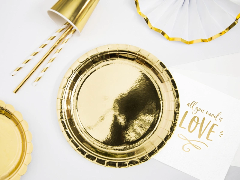 Pro Tip: Aby uzyskać jeszcze bardziej luksusowy efekt, połącz złote talerzyki z białymi serwetkami i złotymi sztućcami. Taki zestaw z pewnością zachwyci Twoich gości.