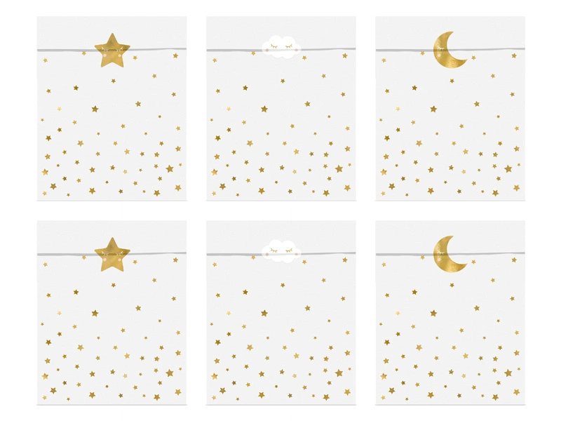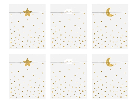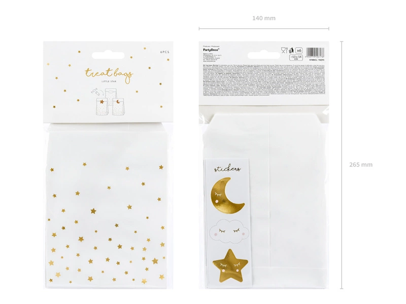 - Torebki na słodycze Little Star wykonane z papieru ze złotym metalizowanym wzorem, zestaw zawiera 6 torebek i 6 naklejek, wymiary po złożeniu ok. 13 x 14cm. (1 op. / 6 szt.)