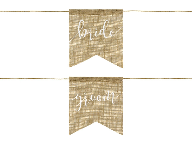 - Zawieszki na krzesło wykonane z juty z białymi napisami Bride i Groom, wymiary ok. 20 x 22 cm. (1 op. / 2 szt.)