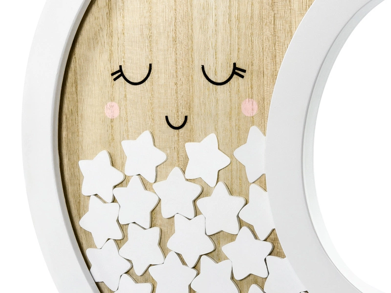 - Drewniana księga gości, zestaw zawiera księgę w kształcie księżyca oraz 30 białych gwiazdek do wypisania, wymiary ok. 38,5 x 30 cm.
