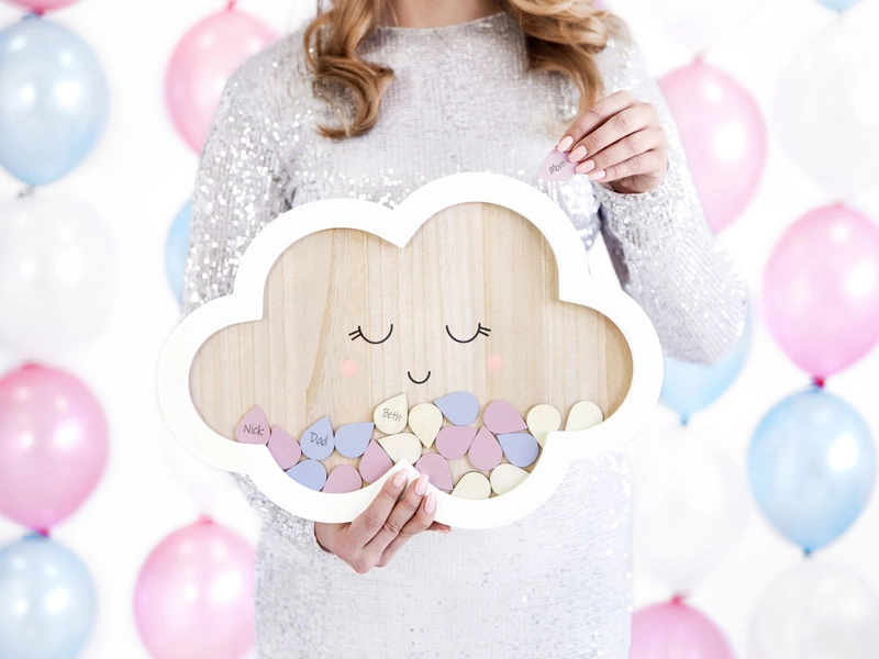 Wprowadź odrobinę magii do swojej imprezy dzięki naszej drewnianej księdze gości w kształcie chmurki! To idealne rozwiązanie na wesela, wieczory panieńskie, urodziny, baby shower i inne wyjątkowe okazje. W zestawie znajdziesz księgę w kształcie chmurki oraz 30 kolorowych kropelek, na których goście mogą wypisać swoje życzenia i wspomnienia.