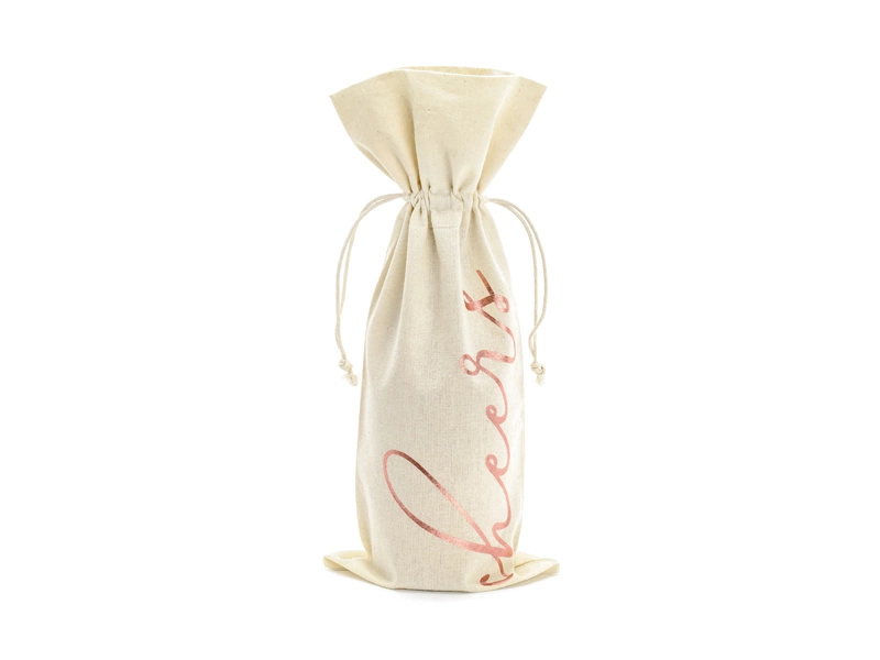 - Ściągane woreczki na wino wykonane z bawełny, z napisem Cheers w kolorze różowego złota, wymiary ok. 15,5 x 36 cm. (1 op. / 5 szt.)