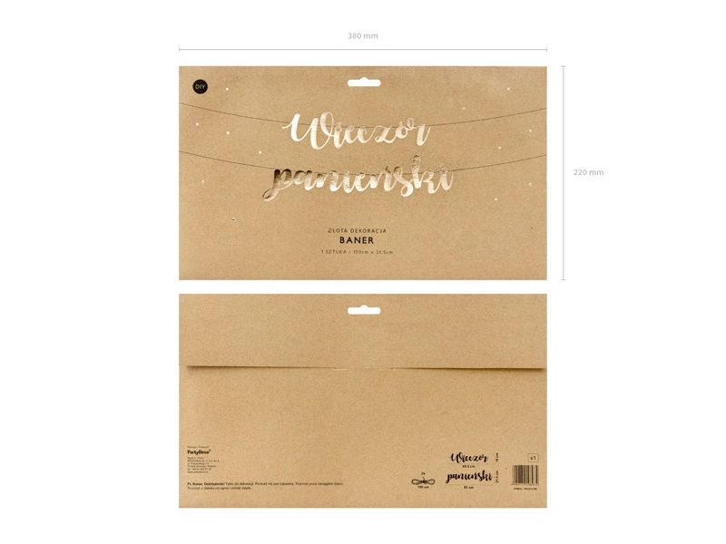 - Baner Wieczór panieński wykonany z lustrzanego papieru w kolorze złotym. Zestaw zawiera napisy: ''Wieczór'' - wysokość ok. 19 cm, długość ok. 69 cm, ''panieński'' - wysokość ok. 21,5 cm, długość ok. 81 cm oraz ok. 3 m złotego sznurka. Produkt do samodzie