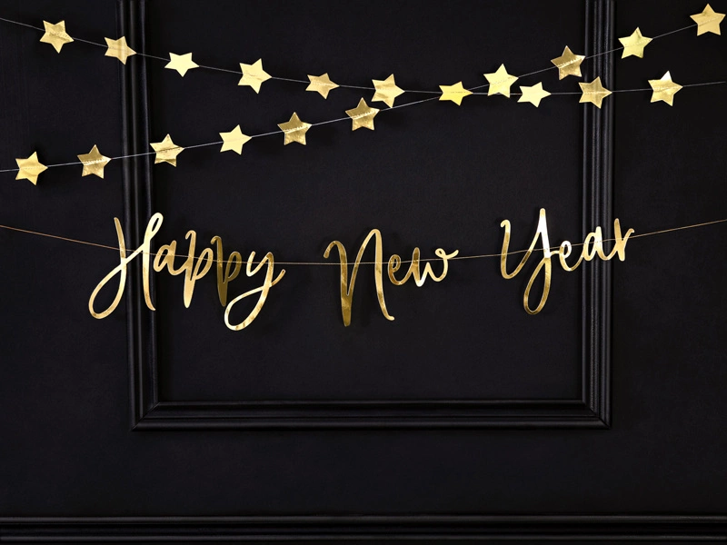 - Przeszywany baner Happy New Year wykonany z papieru w kolorze złotym lustrzanym, długość ok. 66 cm, wysokość ok. 18 cm.