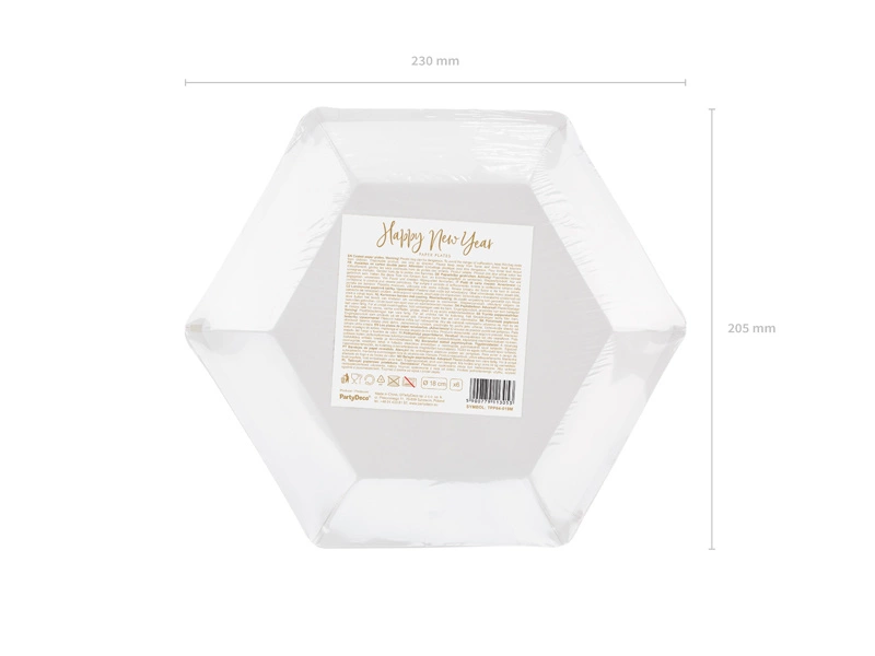 - Talerzyki papierowe w kolorze złotym lustrzanym z białym wzorem gwiazd i napisem Happy New Year, średnica ok. 20 cm. (1 op. / 6 szt.)
