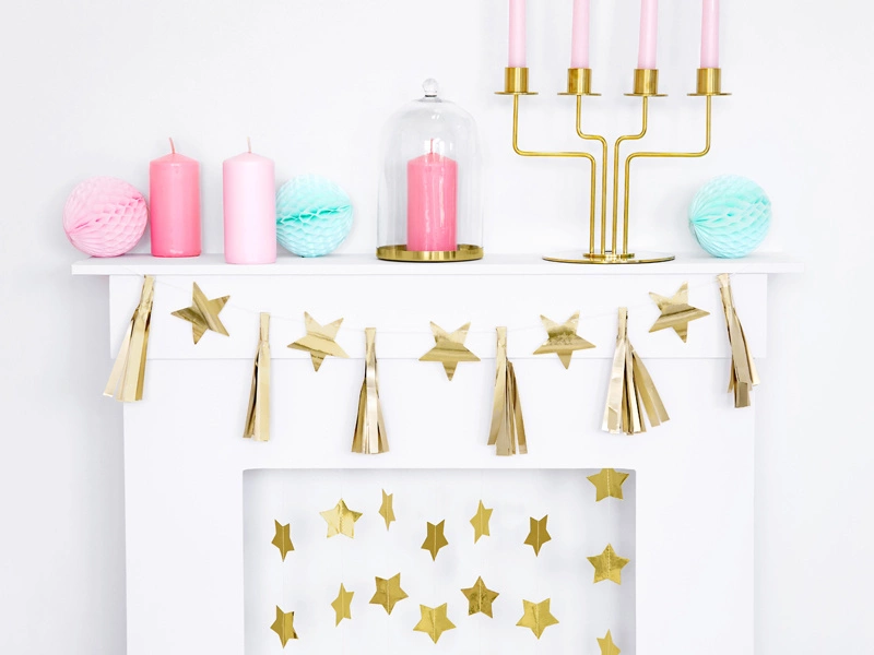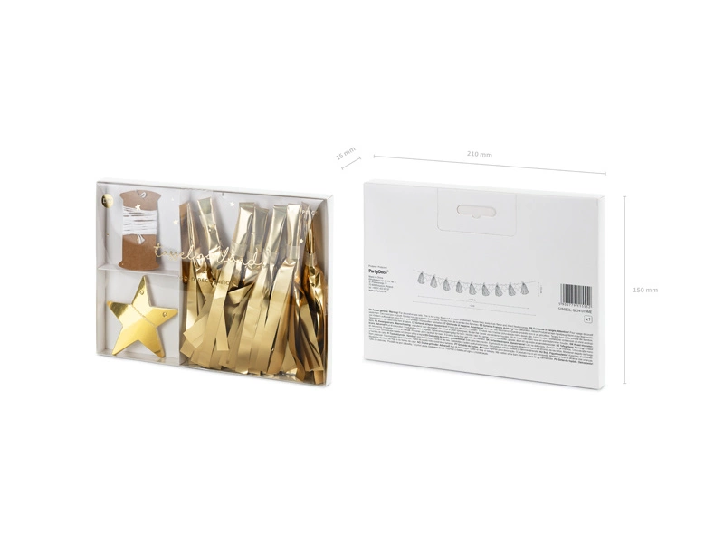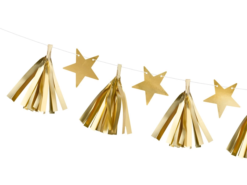- Girlanda papierowa Gwiazdy, zestaw zawiera: 9 złotych frędzli, 8 złotych gwiazd i ok. 2 m białego sznurka. Długość ok. 1,3 m, wysokosć ok. 15 cm. Produkt do samodzielnego zlożenia.
