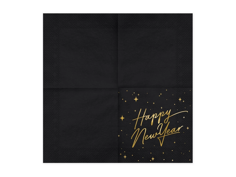 - Serwetki papierowe w kolorze czarnym ze złotym metalizowanym nadrukiem i napisem Happy New Year, wymiary po rozłożeniu ok. 33 x 33 cm, wymiary po złożeniu ok. 16,5 x 16,5 cm. (1 op. / 20 szt.)