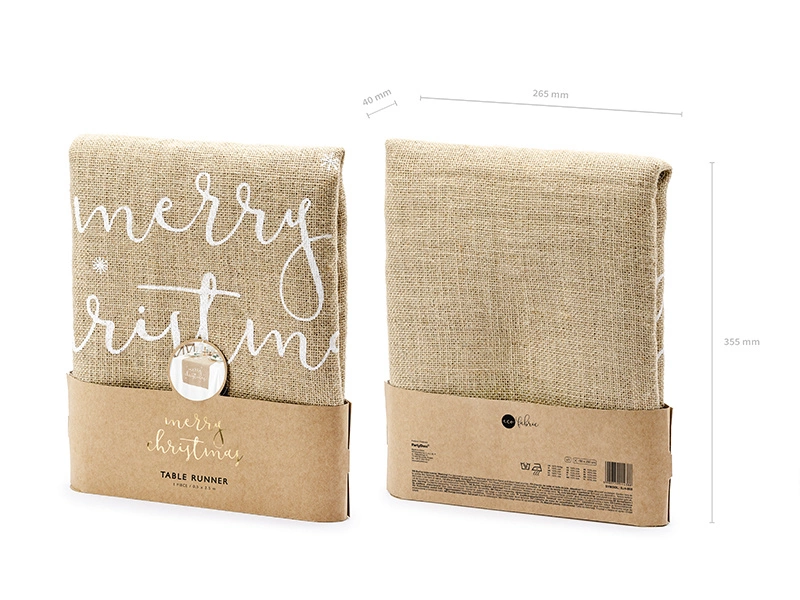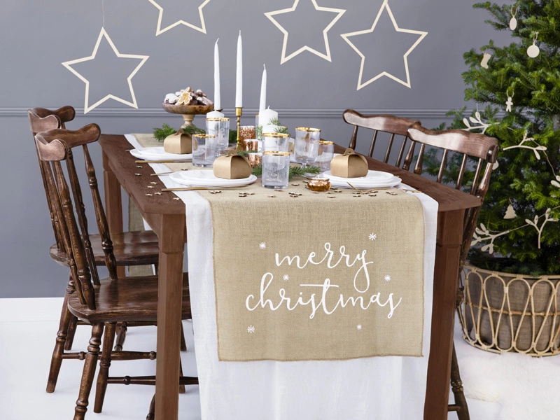 Wprowadź do swojego domu magię świąt dzięki bieżnikowi jutowemu z białym napisem "Merry Christmas" na obu końcach. Ten elegancki dodatek jest idealny na bożonarodzeniowe przyjęcia, tworząc ciepłą i przytulną atmosferę, która zachwyci Twoich gości.
