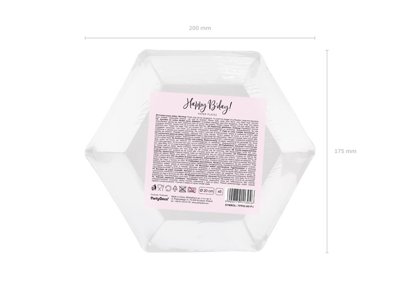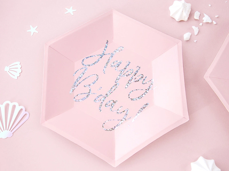 - Talerzyki papierowe w kolorze jasnego pudrowego różu z opalizującym napisem Happy B'day!, średnica ok. 20 cm. (1 op. / 6 szt.)