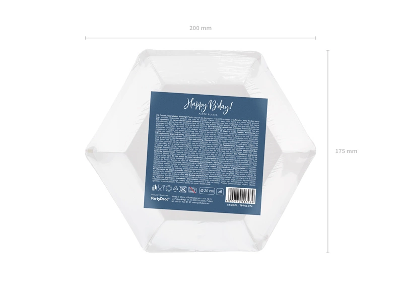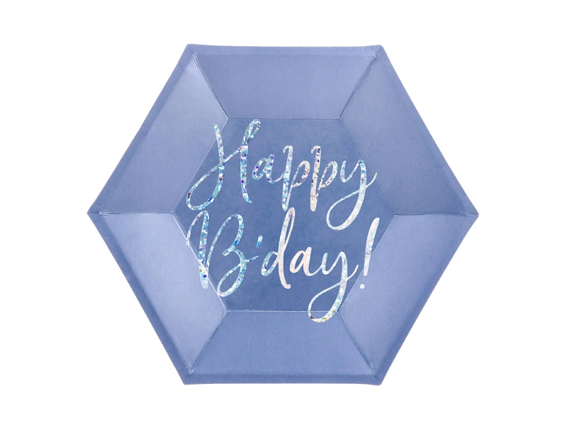 - Talerzyki papierowe w kolorze granatowym z holograficznym napisem Happy B'day!, średnica ok. 20 cm. (1 op. / 6 szt.)