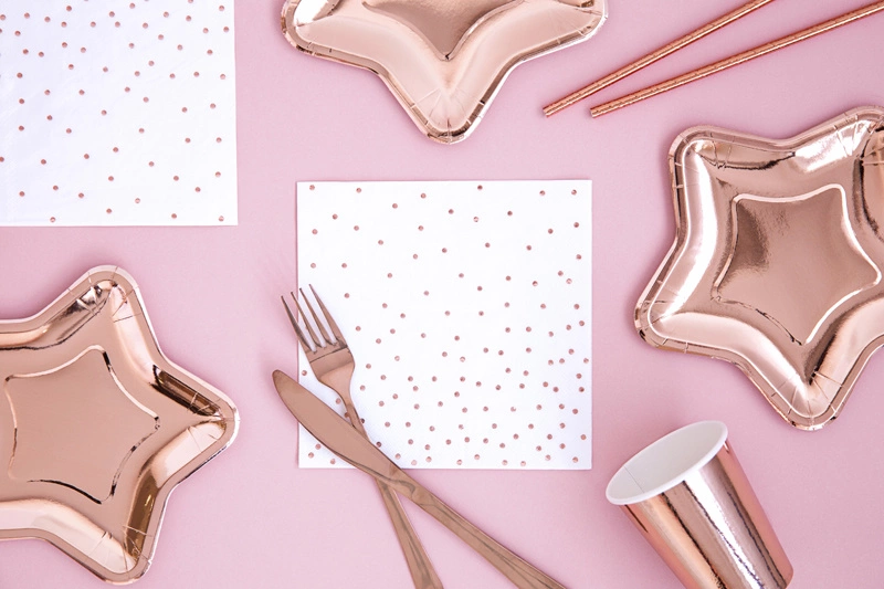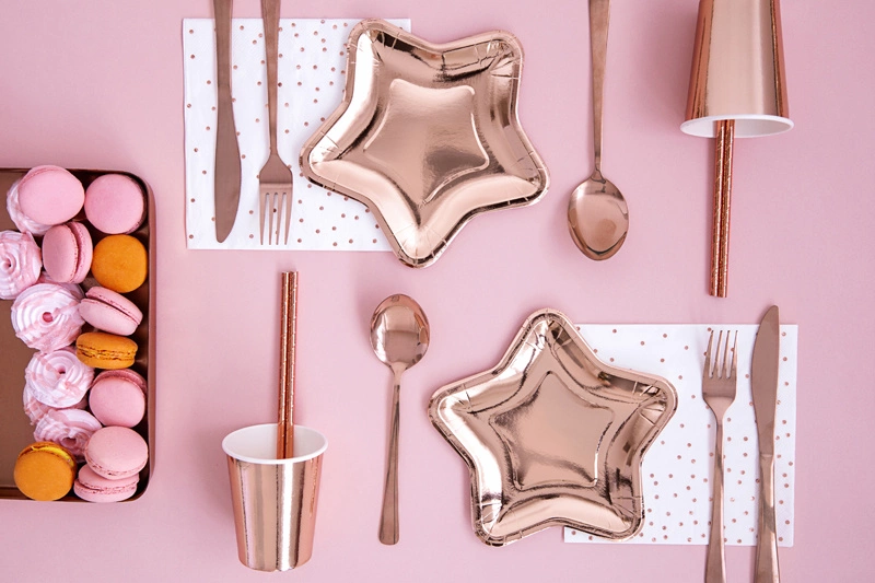 - Użyj talerzyków jako elementu centralnego dekoracji stołu, łącząc je z innymi akcesoriami w kolorze różowego złota.