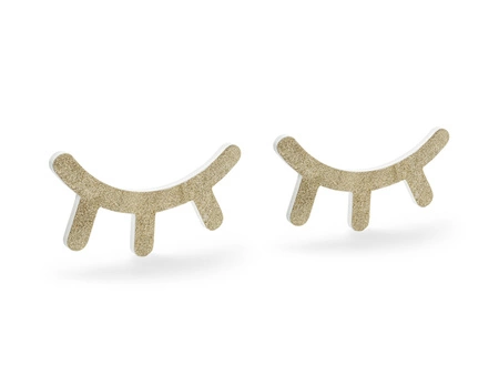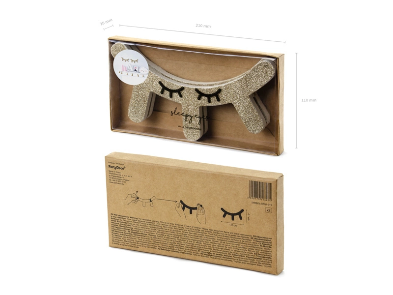 - Drewnian dekoracja na ścianę w kształcie śpiących oczek w kolorze białym ze złotym brokatem na froncie. Zestaw zawiera 2 oczka i taśmę dwustronną. Wymiary 1 sztuki ok. 20 x 11 cm.