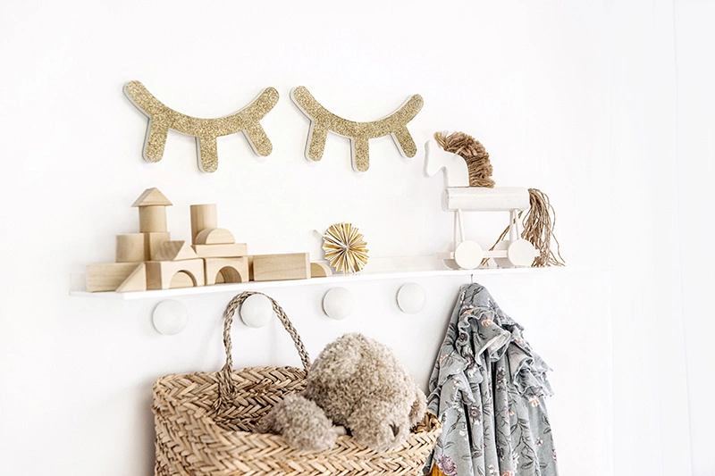 Wprowadź nutę magii do swojego wnętrza dzięki naszej drewnianej dekoracji na ścianę w kształcie śpiących oczek. Starannie wykonana, ta urocza ozdoba w kolorze białym ze złotym brokatem na froncie doda blasku każdemu pomieszczeniu. Zestaw zawiera 2 oczka oraz taśmę dwustronną, co ułatwia montaż. Idealna na różne okazje, od urodzin po baby shower.