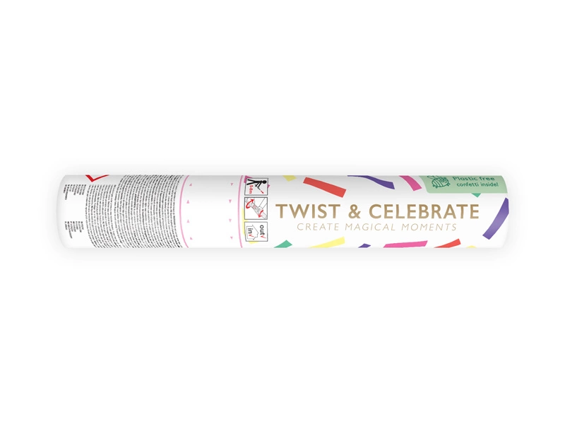 - Tuba strzelająca papierowym, kolorowym konfetti, długość 20 centymetrów.