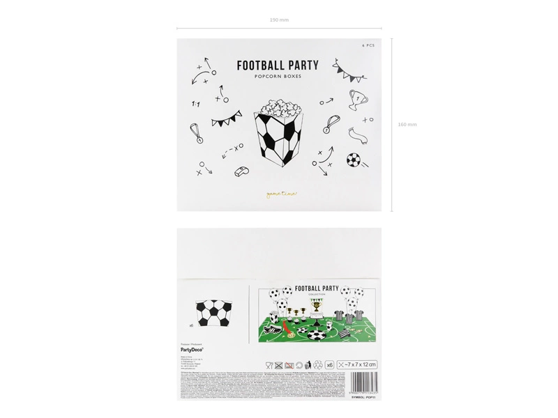 - Pudełka na popcorn Piłka w kolorze białym z czarnym nadrukiem, wymiary po złożeniu ok. 7 x 7 x 12 cm. (1 op. / 6 szt.)
