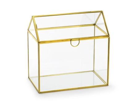 - Szklane pudełko na koperty w kształcie domku ze złotym obramowaniem, wielkośc ok 13x21x21 cm.