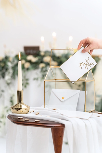 - Umieść pudełko na widocznym miejscu, np. na stole z prezentami lub przy wejściu, aby goście mogli łatwo wrzucić koperty.