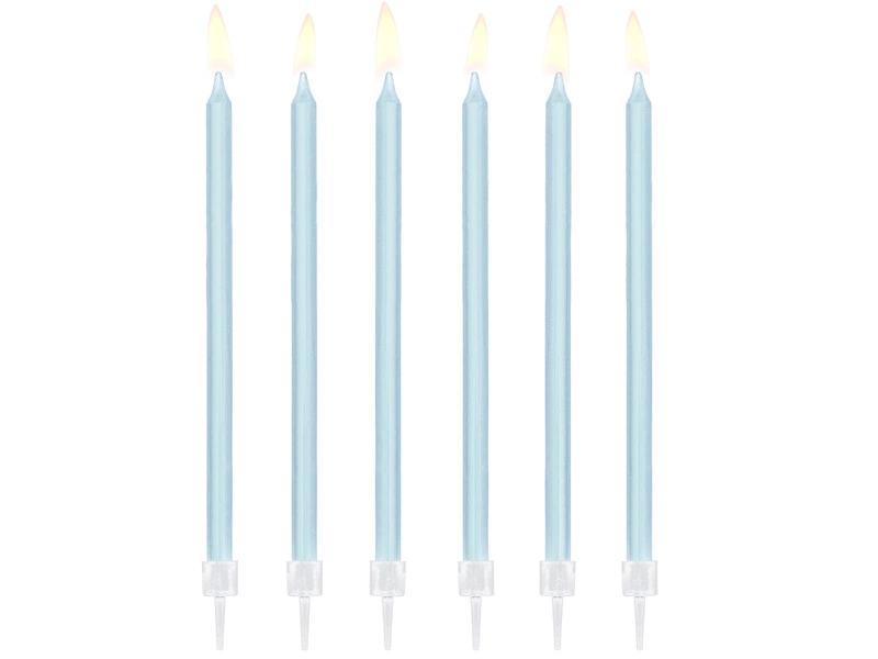 - Świeczki urodzinowe gładkie w kolorze jasnoniebieskim, wysokość ok. 14 cm. Zestaw zawiera 12 świeczek i podstawek. (1 op. / 12 szt.)