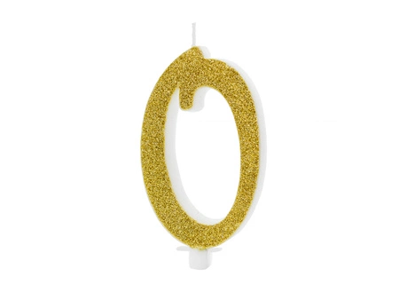 - Świeczka urodzinowa Cyferka 0 w kolorze złotym brokatowym, rozmiar ok. 10cm.