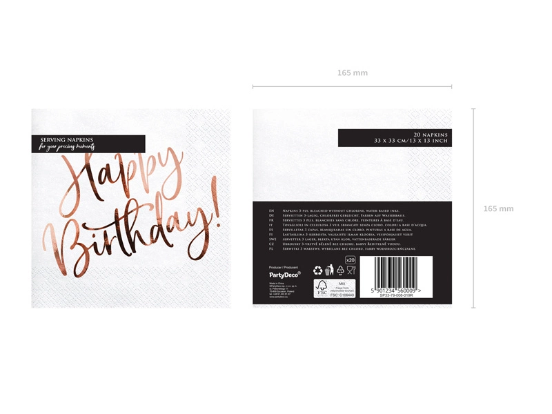 - Serwetki papierowe w kolorze białym, z metalizowanym napisem Happy Birthday w kolorze różowego złota, wymiary po rozłożeniu ok. 33 x 33 cm, wymiary po złożeniu ok. 16,5 x 16,5 cm. (1 op. / 20 szt.)