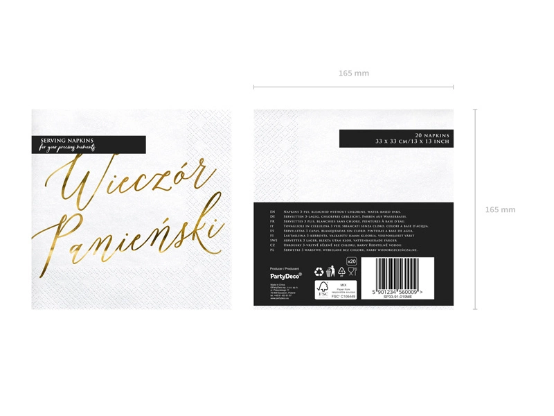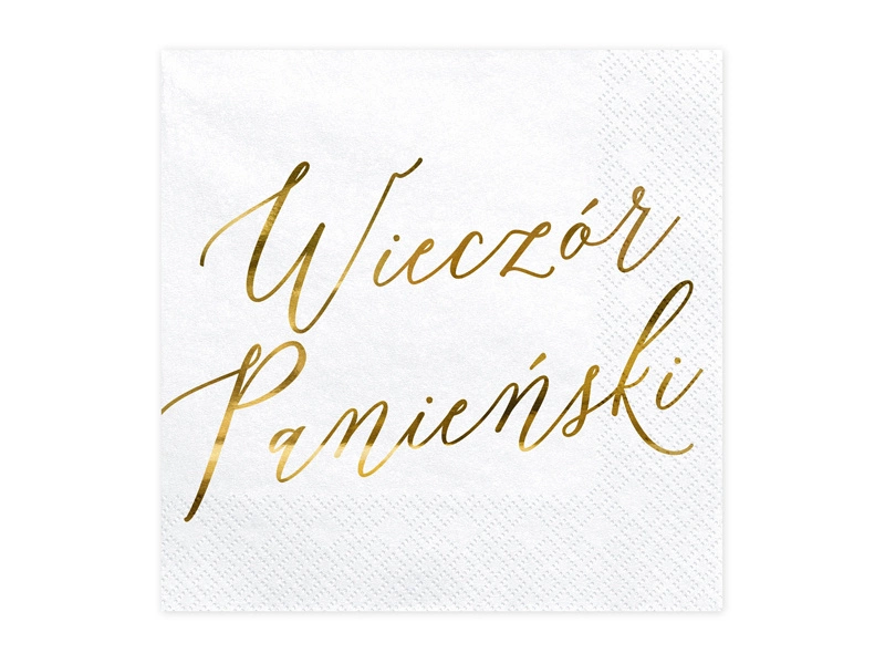 - Serwetki papierowe w kolorze białym ze złotym metalizowanym napisem Wieczór panieński, wymiary po rozłożeniu ok. 33 x 33 cm, wymiary po złożeniu ok. 16.5 x 16.5 cm. (1 op. / 20 szt.)