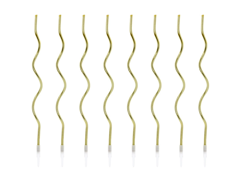- Świeczki urodzinowe zakręcone, w kolorze złotym metalizowanym, wysokość ok. 14 cm. Zestaw zawiera 8 świeczek i podstawek. (1 op. / 8 szt.)