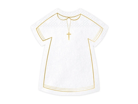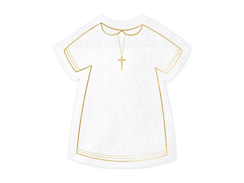 - Serwetki papierowe w kształcie alby komunijnej w kolorze białym ze złotym metalizowanym nadrukiem, wymiary po rozłożeniu ok. 28 x 32 cm, wymiary po złożeniu ok. 14 x 16 cm. (1 op. / 20 szt.)