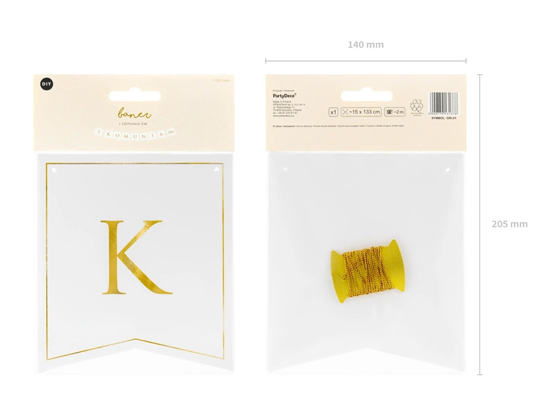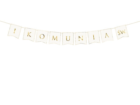 - Baner I Komunia Św. wykonany z papieru, zestaw zawiera litery oraz ok. 2m złotego sznurka, wymiary po złożeniu: wysokość ok. 15 cm, długość: ok. 133 cm. Produkt do samodzielnego złożenia.