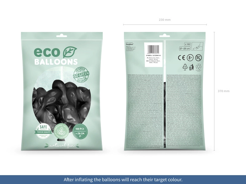 - Balony Eco metalizowane w kolorze czarnym, średnica ok. 26 cm. (1 op. / 100 szt.)