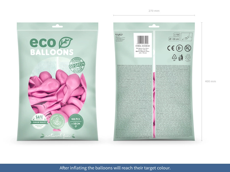 - Balony Eco metalizowane w kolorze różowym, średnica ok. 30 cm. (1 op. / 100 szt.)