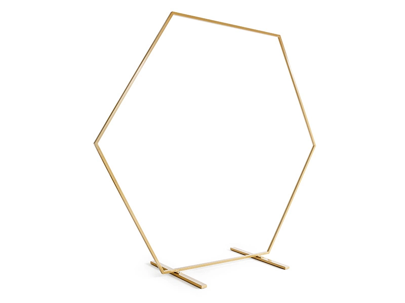 - Stojak na tło w kształcie heksagonu, wykonany z metalu w kolorze złotym, średnica po złożeniu ok. 2 m. Produkt łatwy w montażu, po złożeniu stanowi stabilną konstrukcję. Nadaje się do wielokrotnego użycia, idealny do profesjonalnego zastosowania.